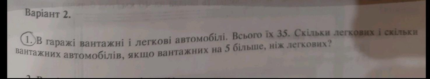 Відповідь: в гаражі знаходяться 20 ватажних машин та 15 легкових автомобілів.