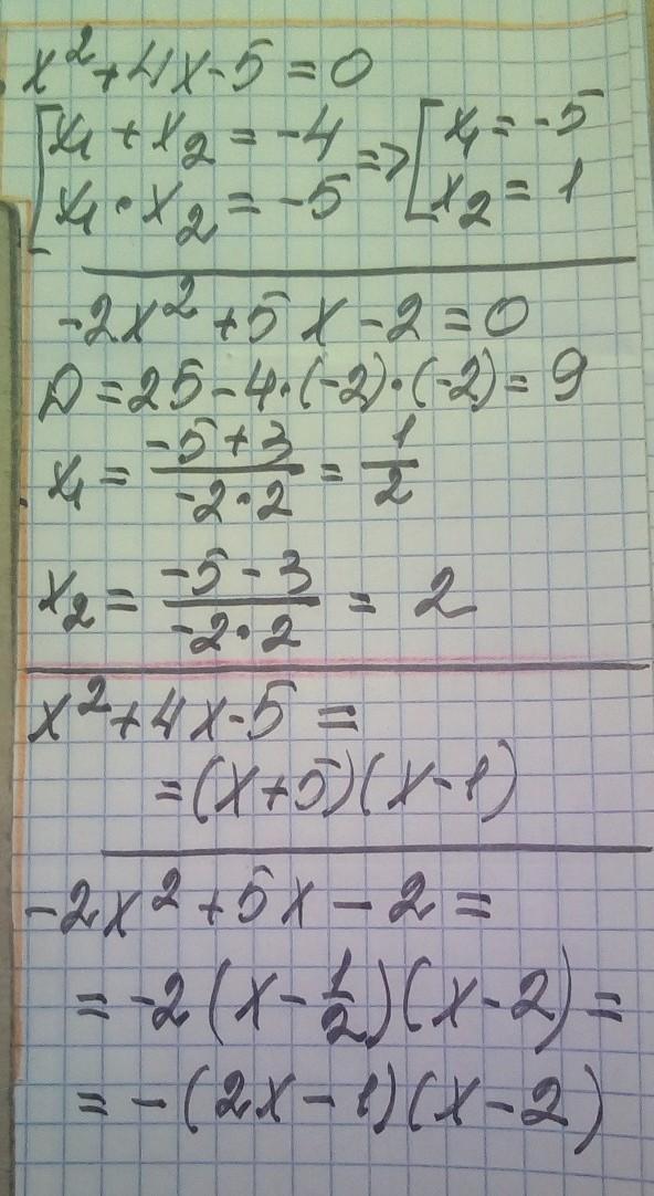 1. (2 бали) Розкладіть на множники квадратний тричлен 1) х2+4x-5; 2)-2x²+5x-2. ​