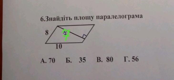 не правильно. Площадь параллелограмма равна произведению высоты и стороны, к которой проведена высота. 7*8=56 (Г)