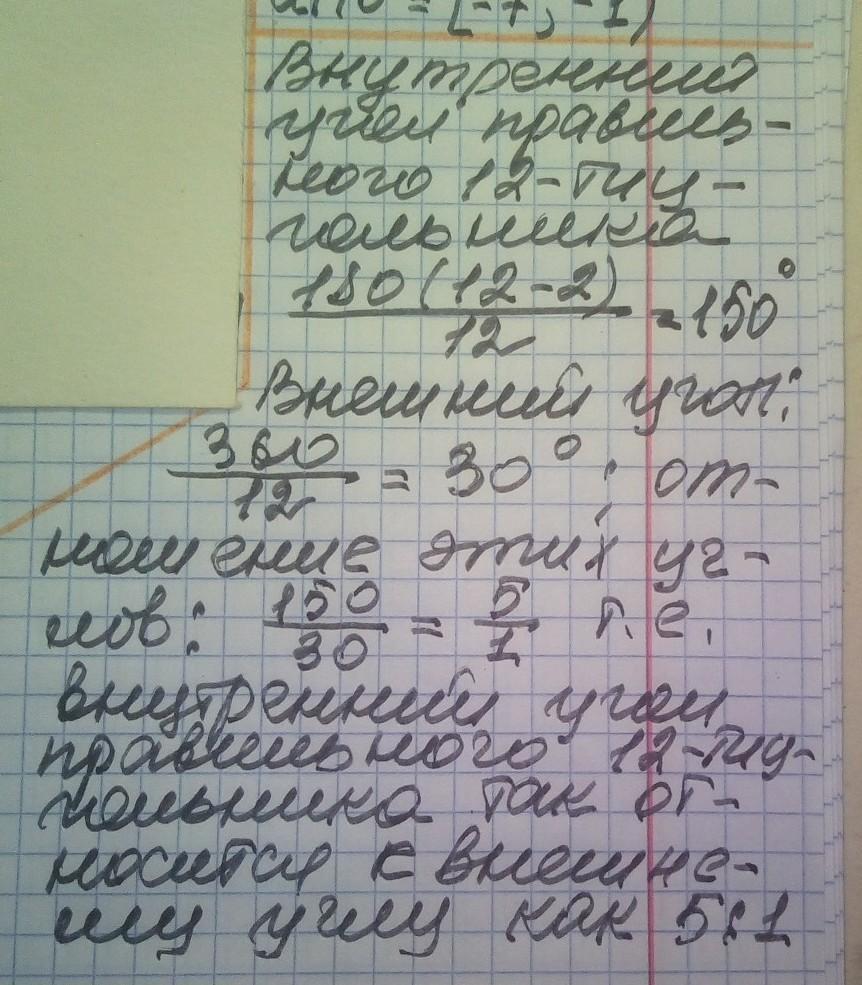 Найдите отношение внутреннего угла к внешнему в правильном 12-ти угольнике​