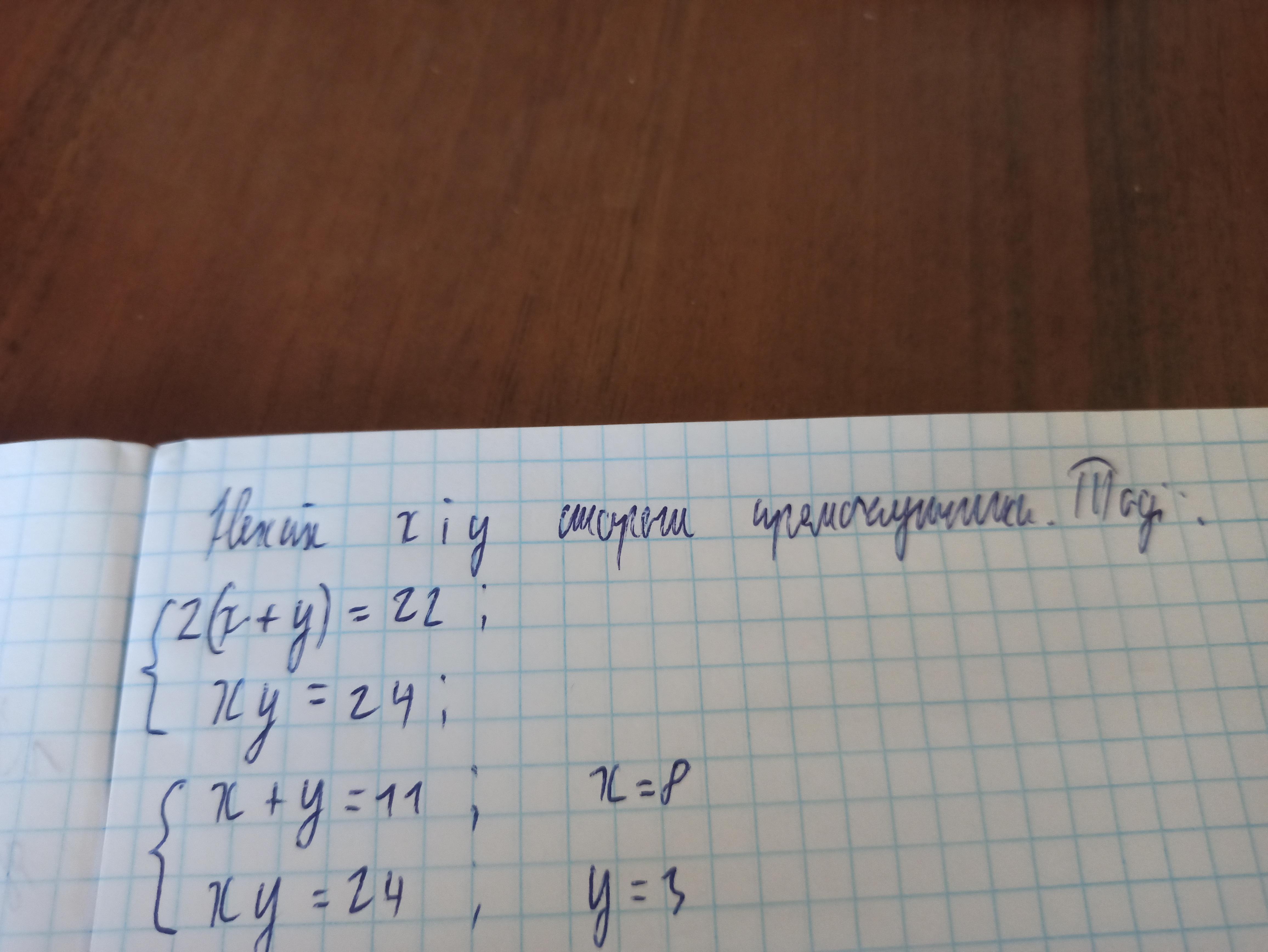 Срочно. Знайдіть сторони прямокутника, якщо його периметр дорівнює 22см,а площа становить 24 см2.