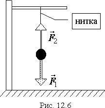 Дія Землі на тіло напрямлена вниз ( F1 ), а дія нитки (F2 ) – вгору. Векторна сума сил F1 та F2 дорівнює нулю (дія Землі та нитки компенсується), тому тіло знаходиться у стані спокою відносно Землі.