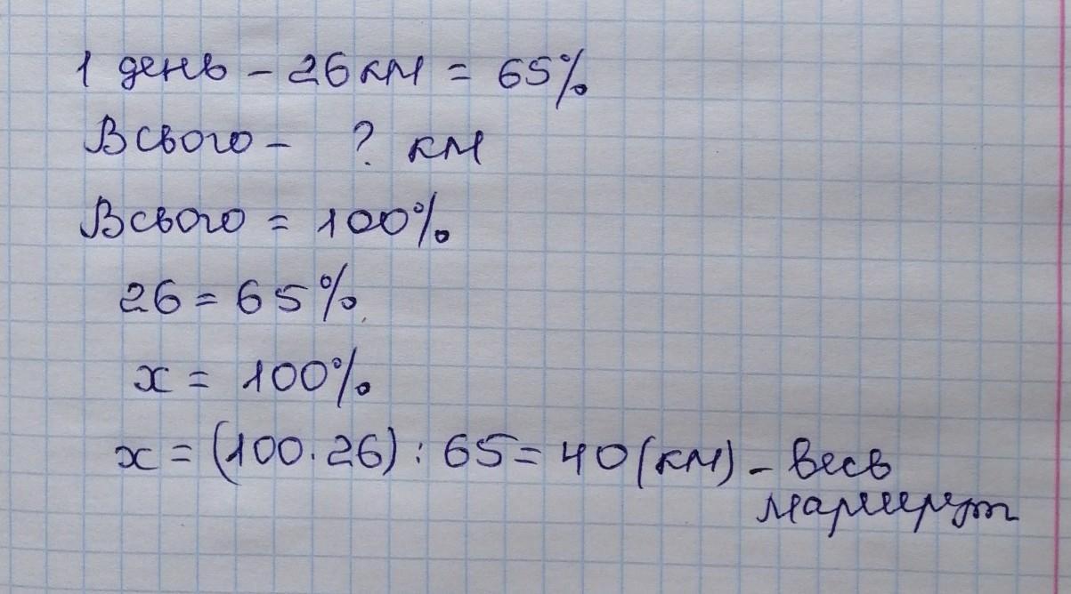 Першого дня турист пройшов 26 км, що становить 65% довжини туристичного маршуту. Яка довжина маршруту?