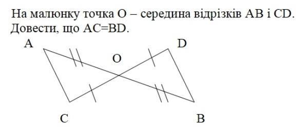 Згідно з малюнком розглянемо трикутники ACO i ODB. В них: AO=OB; CO=OD. Також кути AOC=DOB - як вертикальні. Отже, ці трикутники рівні за одною із ознак рівності трикутників (за двома сторонами і кутом між ними)