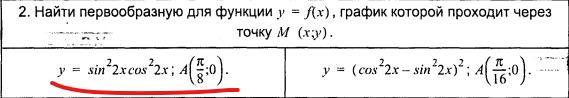 Требуется найти первообразную F(x) для заданной функции, проходящую через точку А, то есть такую первообразную, для которой F(π/8) = 0.
