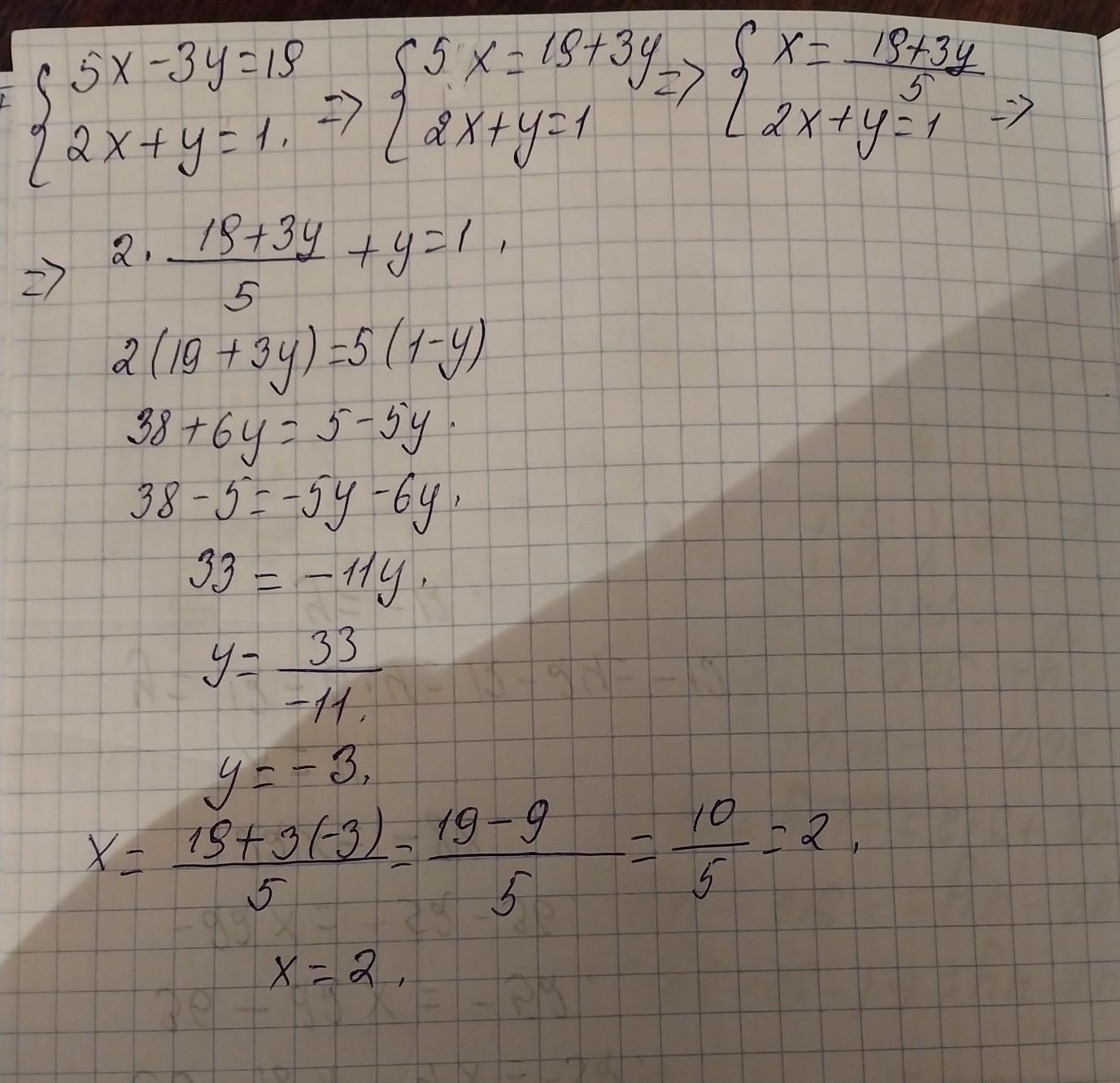 Розв’язати систему рівнянь Отримати відповідь (х; у). У відповідь записати добуток х·у. 5x-3y=19;2x+y=1