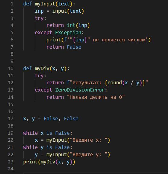 Опишите функцию которая производит деление чисел, Обработайте исключение при делении на ноль.