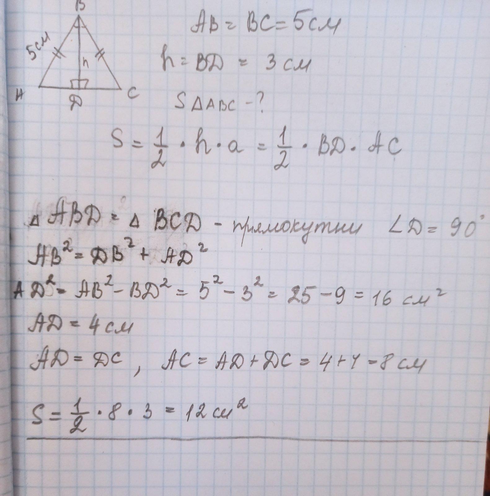 Бічна сторона рівнобедреного трикутника дорівнює 5 см, а висота, проведена до основи, - 3см. Знайти площу даного трикутника.