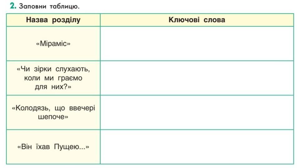 1.Він у дорозі день і ніч 2.У трояндовому садку 3.Міраміс 4.Чи зірки слухають , коли ми граємо до них ? 5.Колодязь , що ввечері шепоче 6.Він їхав пущею ... 7.Зачаровані птахи 8.У мертвому лісі 9.Найглибша печера у найчорнішій горі 10.Залізний пазур 11. Страшнішого меча я ще не бачив у своєму замку 12.Mio , мій Mio