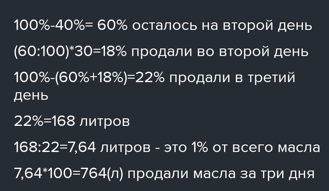 Першого дня продали - 40% олії, другого - 30% того, що осталося, а третього дня решту 168 л. Скільки літрів олії продали за три дні?