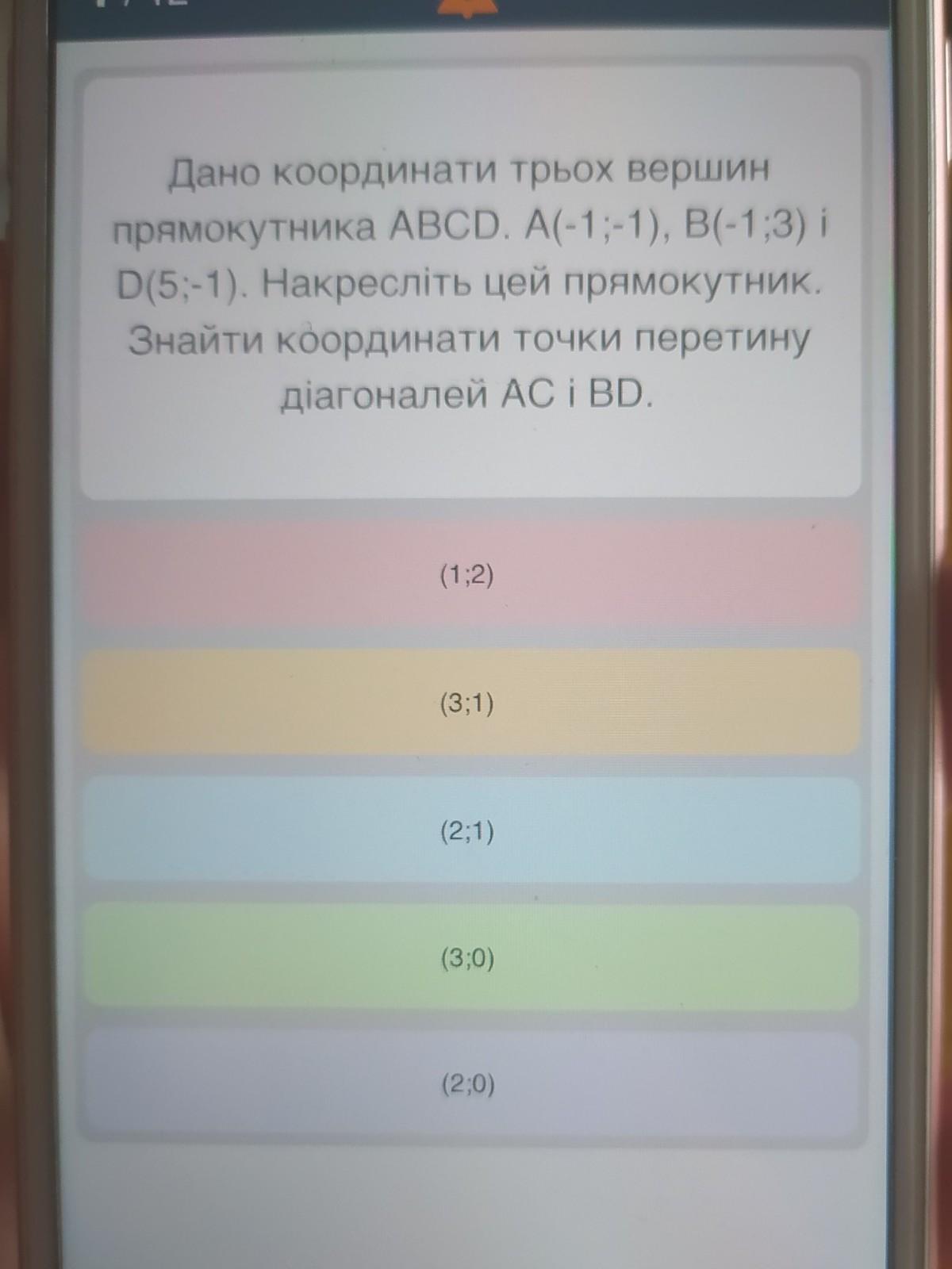1/12 А Дислексiя Дано координати трьох вершин прямокутника ABCD. A(-1;-1), B(-1;3) i D(5;-1). Накресліть цей прямокутник. Знайти координати точки перетину діагоналей AC i BD