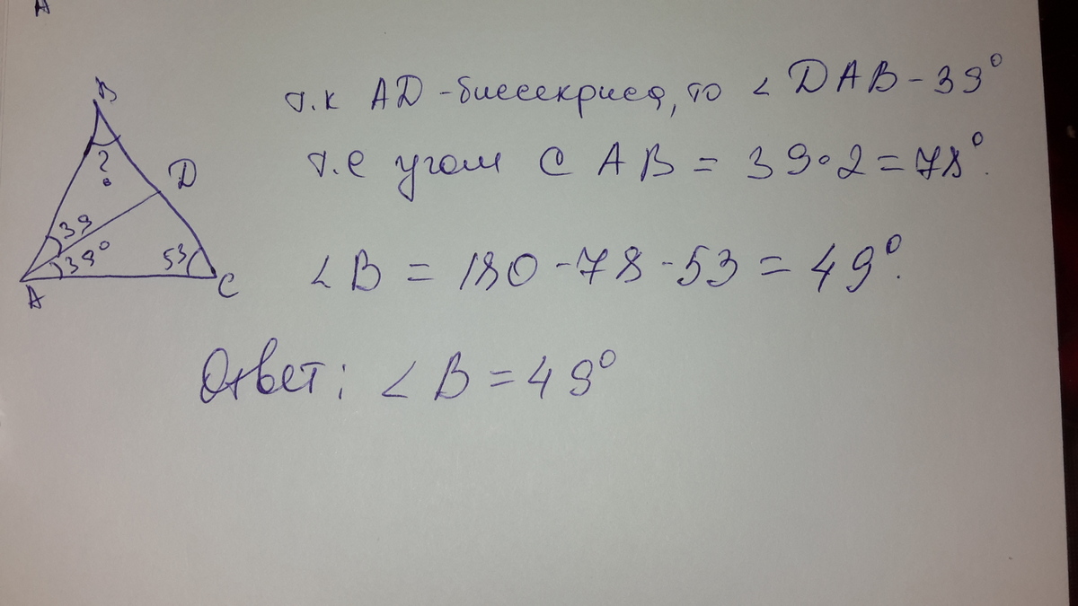 в треугольнике ABC AD -биссектриса ,угол C равен 53°угол CAD равен 39°.найдите угол B.ответ дайте в градусах.(ответ должен получиться 49)