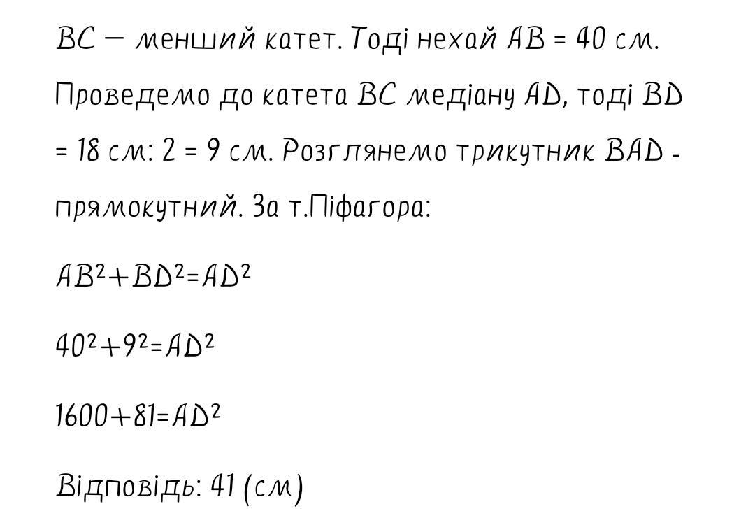 BC – менший катет. Тоді нехай АВ = 40 см. Проведемо до катета ВС медіану AD, тоді BD = 18 см: 2 = 9 см. Розглянемо трикутнтрикутникиктриктриутник, BAD прямокутнийпрямокутнийпрямокутнийпрямокутнийhdnssnu.