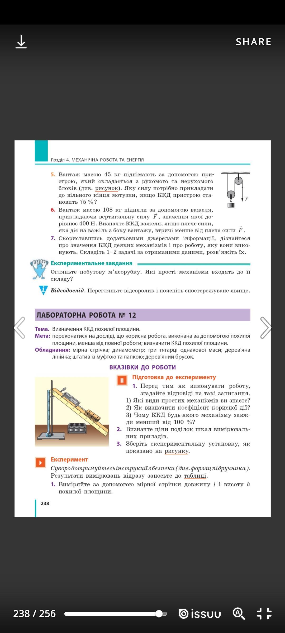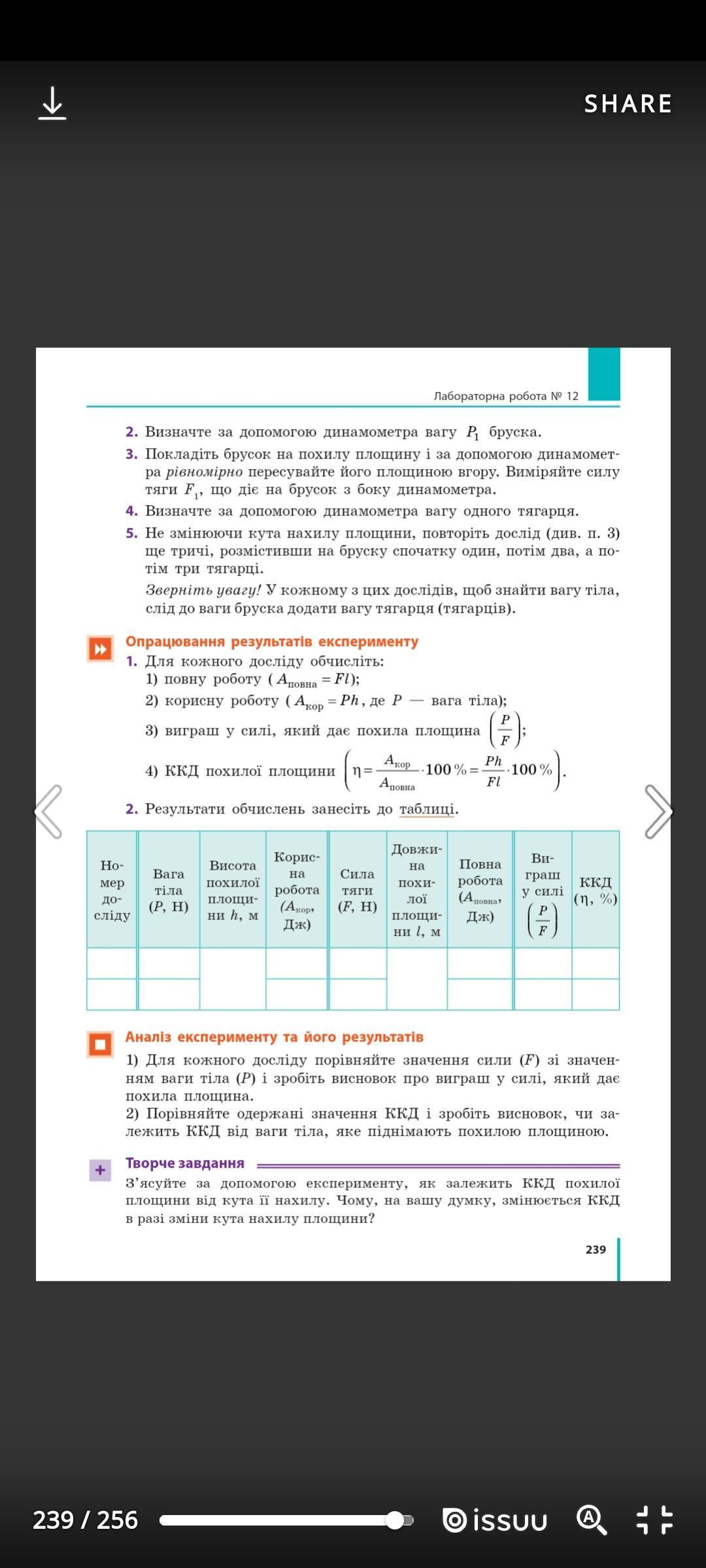 На цій лабораторній роботі ми навчились визначати ККД похилої площини. Також ми за допомогою досліду переконались, що корисна робота, виконана за допомогою похилої площини, менша від повної роботи. І також порівняли значення сили зі значенням ваги тіла.