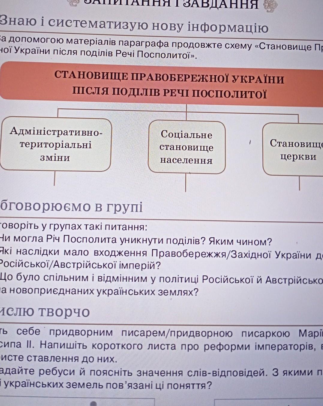 За допомогою матеріалів параграфа продовжте схему «Становище Правобе- режної України після поділів Речі Посполитої».