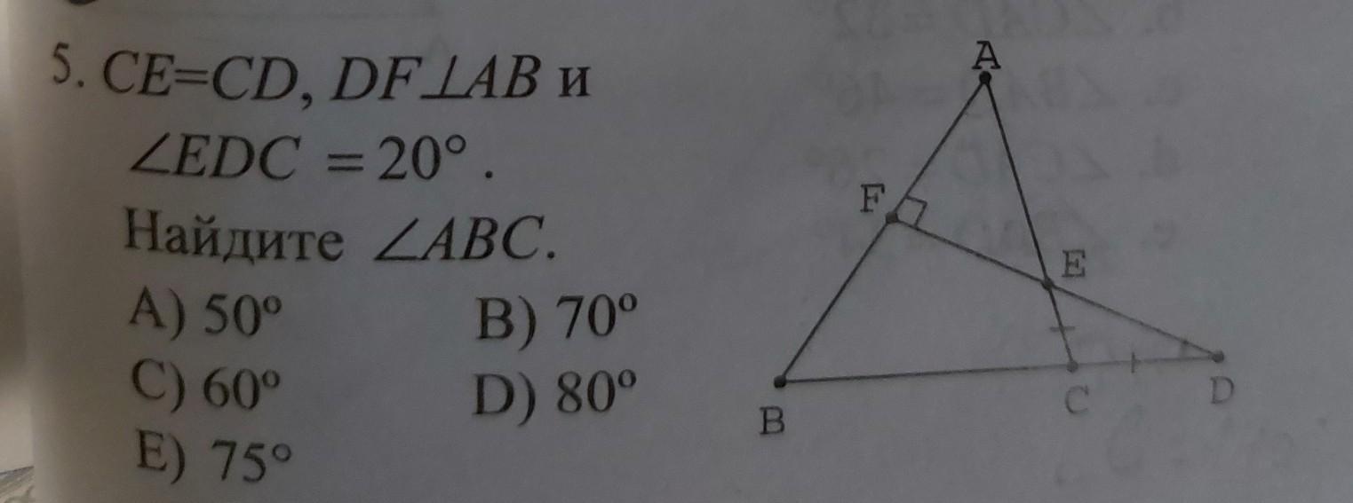 5. CE=CD, DF перпендикулярно АВ и угол EDC =20°. Найдите угол ABC. A) 50° C) 60° E) 75° B) 70° D) 80°