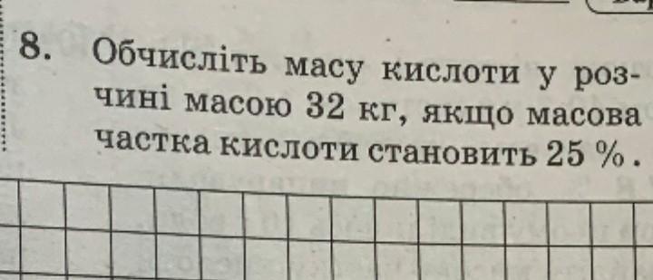 Обчисліть масу кислоти у розчині масою 32 кг, якщо масова частка кислоти становить 25%