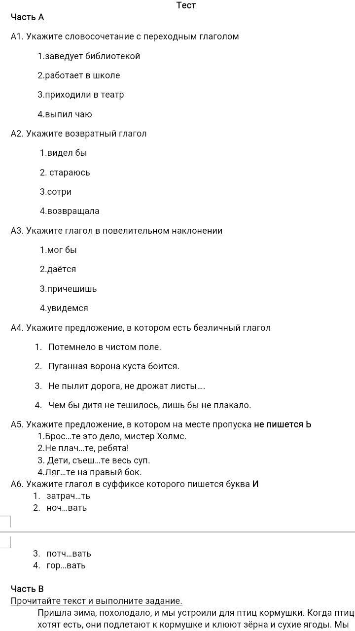 Відповідь:А1) 3А2) 2А3) 3А4) 1А5) 4А6) 1В1) глагол есть , начальная форма - есть; хотят, начальная форма - хотетьВ2) хотят естьВ3) изъявительное