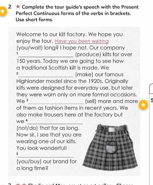 2). 'Welcome to our kilt factory. We hope you enjoy the tour. Have you been waiting long? I hope not. Our company's been producing kilts for over 150 years. Today we are going to see how a traditional Scottish kilt is made. We've been making our famous Highlander model since the 1920s. Originally kilts were designed for everyday use, but later they were worn only on more formal occasions. We've been selling more and more of them as fashion items in recent years. We also make trousers here at the factory but we haven't been doing that for as long. Now sir , I see that you are wearing one of our kilts. You look wonderful! Have you been buying our brand for a long time?