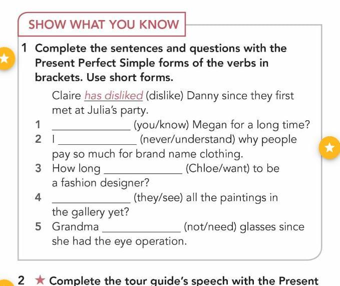 1). 1. Have you known Megan for a long time?2. I have never understood why people pay so much for brand name clothing.3. How long has Chloe wanted to be a fashion designer? 4. Have they seen all the painting in the gallery yet?5. Grandma hasn't needed glasses since she had the eye operation.