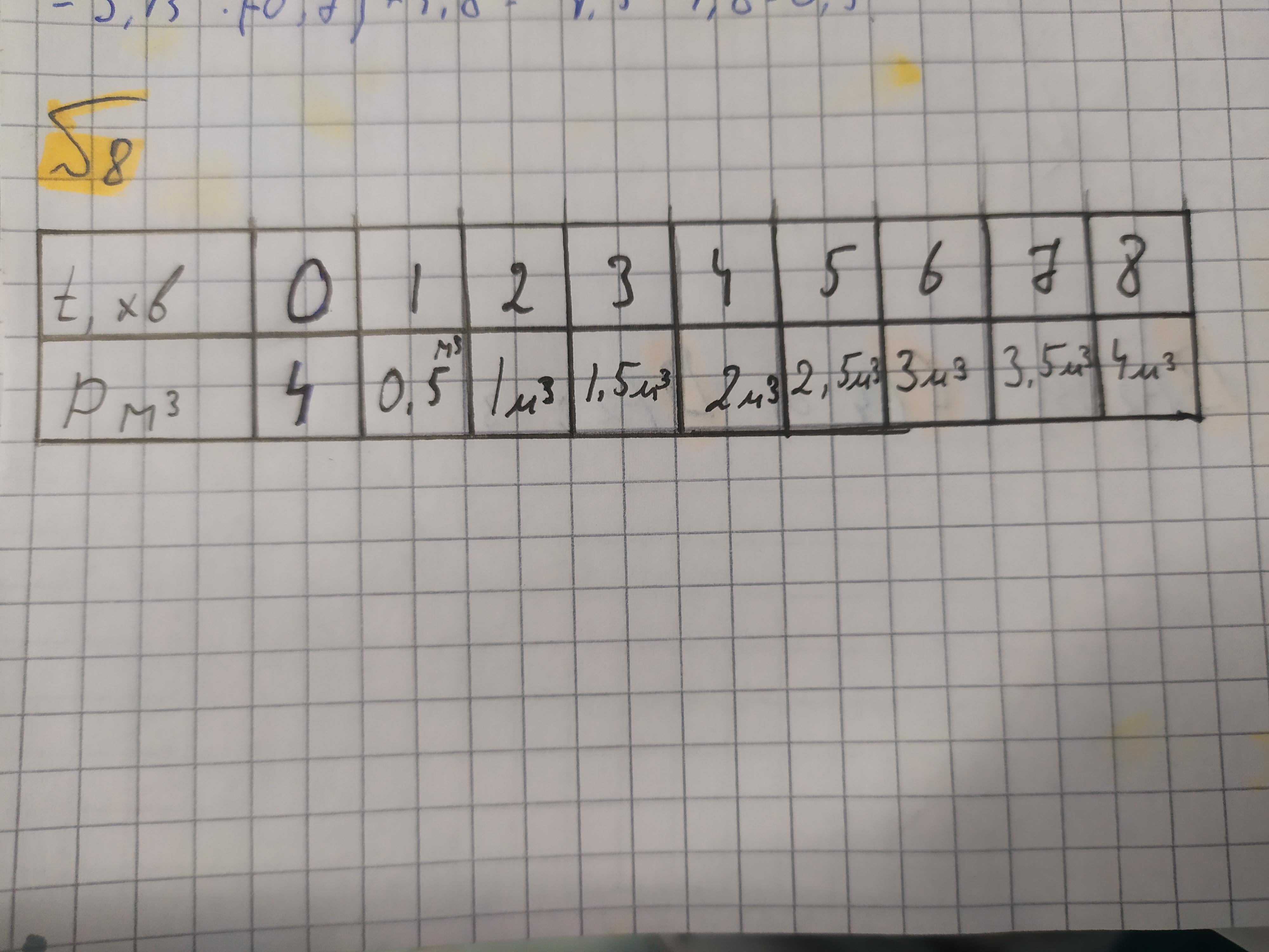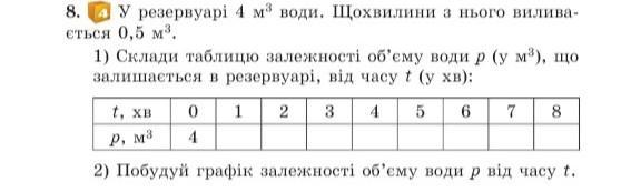 8. У резервуарi 4 м3 води. Щохвилини з нього вилива- ється 0,5 м3. 1) Склади таблицю залежності об'єму води р (у м3), що залишається в резервуарі, від часу t (у хв): t, XB 01 2 3 5 6 7 8 P, M3 4