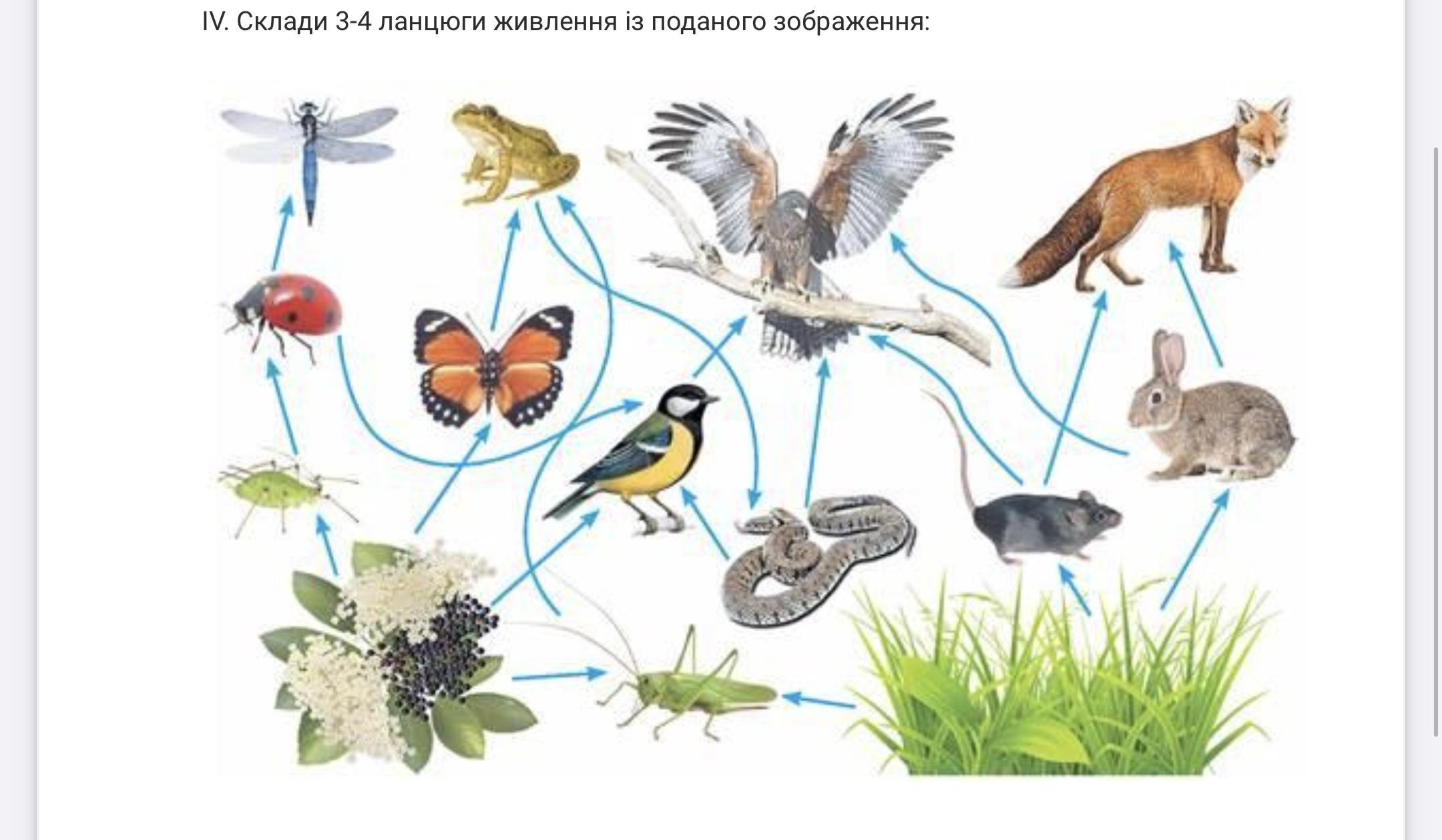 2. Трава-стрибунець-жаба-змія-орел (Стрибунець їсть траву, потім стрибунця їсть жаба, жабу з' їдає змія, а змію їсть орел).
