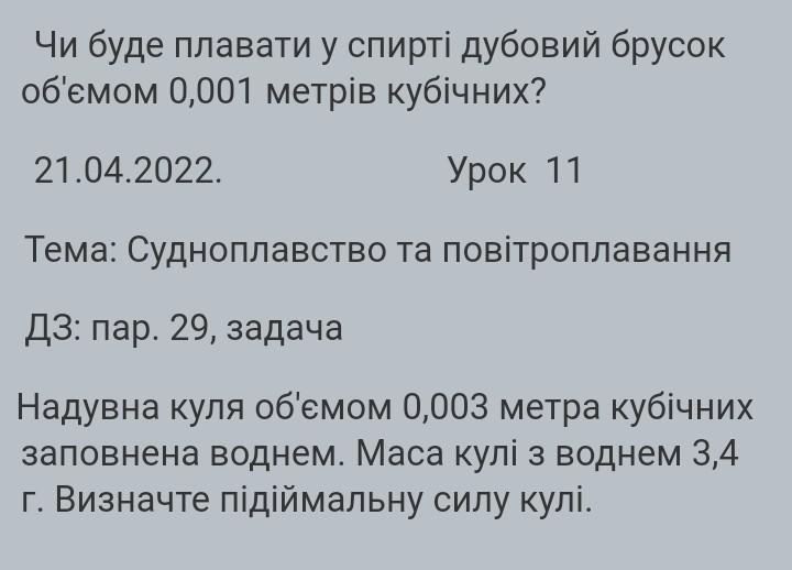 Відповідь: Залежить від вологості бруска. Дубовий брусок з вологістю до 30 % буде плавати у спирті оскільки його густина менша від густини спирту (густина дуба при 30 % вологості ρ=760 кг/м³, а спирту ρ=800 кг/м³), а наприклад при при 40 % вологості - тонути (густина дуба при 40 % вологості ρ=820 кг/м³>800 кг/м³)