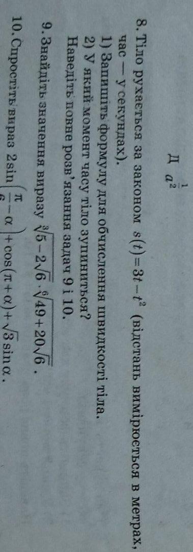 8) Тело движется по закону заданному функцией S(t)=3t-t^2. Найти формулу для вычисления скорости тела и определить, в какой момент времени тело остановится, если время t измеряется в секундах, расстояние S - в метрах.