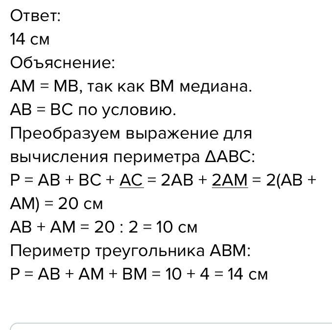 периметр трикутника ABC 20см, а довжина його медіани BM 4см. Знайдіть периметр трикутника АВМ, якщо АВ=ВС