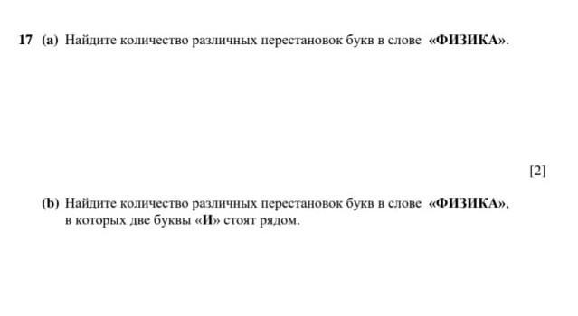 17 (a) Найдите количество различных перестановок букв в слове «ФИЗИКА». [2] (b) Найдите количество различных перестановок букв в слове «ФИЗИКА», в которых две буквы > стоят рядом.