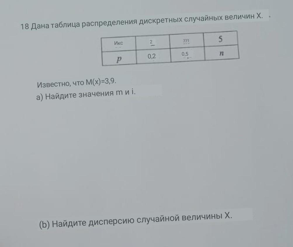 Дана таблица распределения дискретных случайных величин X. Икс 2 771 0,2 0,5 Известно, что М(х)=3,9. а) Найдите значения m и i. (b) Найдите дисперсию случайной величины X.