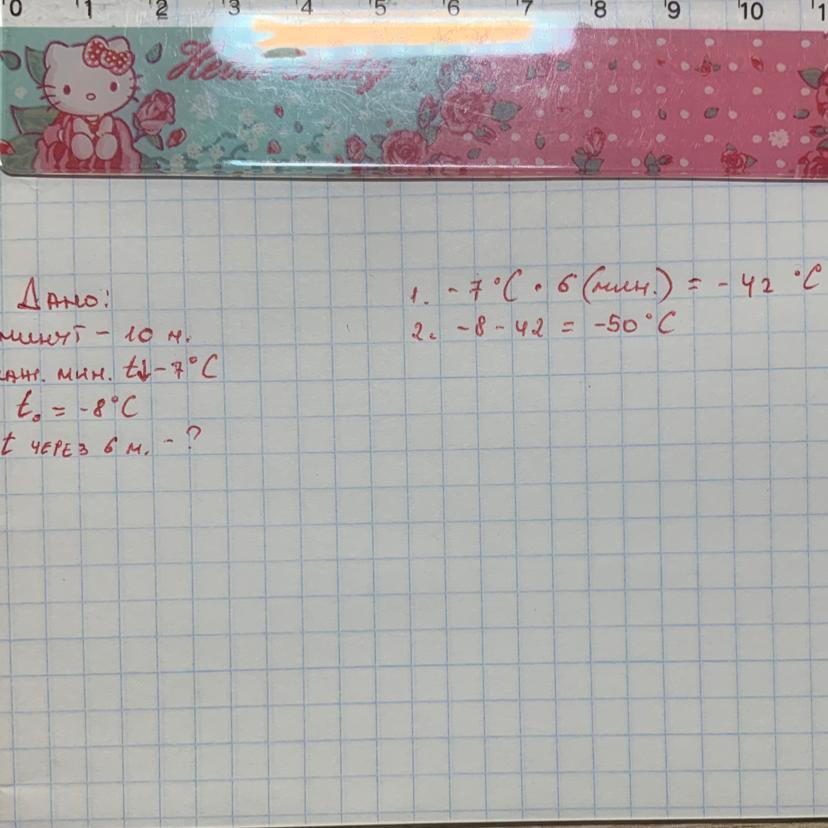 При проведении опыта вещество равномерно охлаждали в течение 10 минут. При этом каждую минуту температура вещества уменьшалась на 7°C. Найдите температуру вещества (в градусах Цельсия) через 6 минут после начала проведения опыта, если его начальная температура составляла -8°С.