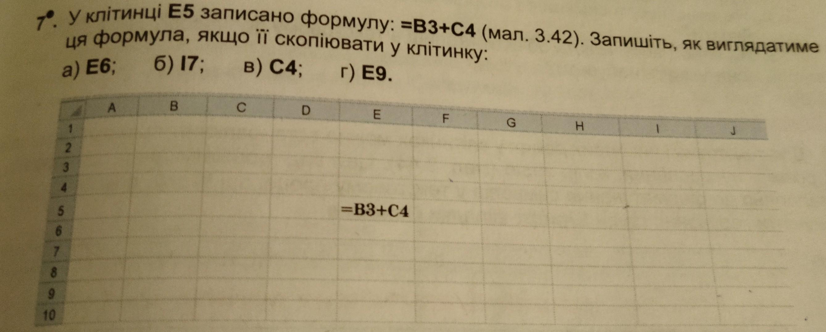 Завдання 7. У клитинци E5 записано формУлу: =B3+C4. Запишить, як виглядатиме ця формула, Якщо її скопіювати у клитинку: