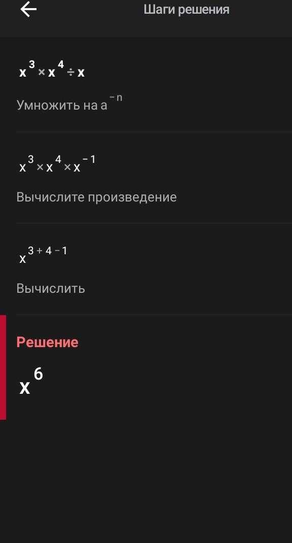 х³•х⁴ : х = х³⁺⁴ : х = х⁷ : х¹ = х⁷⁻¹ = х⁶ .