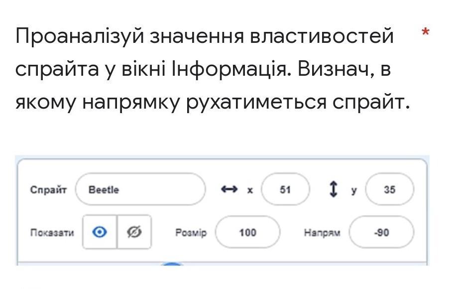 Проаналізуй значення властивостей спрайта у вікні Інформація. Визнач, в якому напрямку рухатиметься спрайт