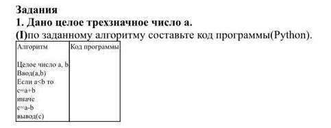 1. Дано целое трехзначное число а. (1)по заданному алгоритму составьте код программы(Python). Алгоритм Кол программы Целое число а, b Ввод(a,b) Если a>b то c-a-b иначе ca+b вывод(с)