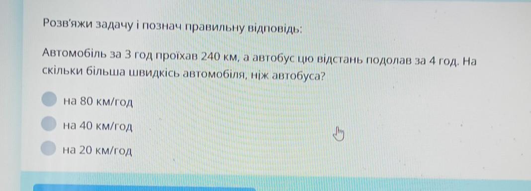 Відповідь: Швидкість автомобіля більша на 20 км від швидкості автобуса.