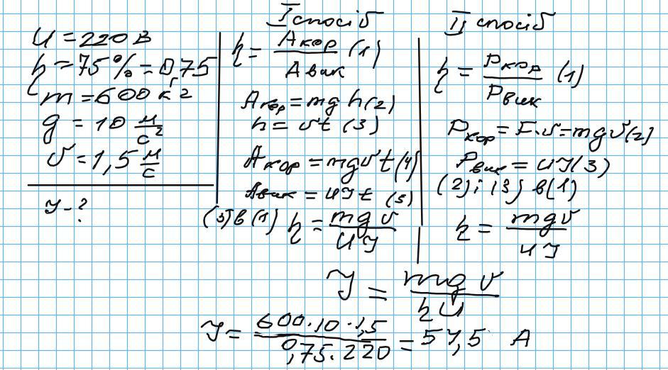 Двигун ліфта працює від мережі 220 В. Його ККД становить 75 %. Яку