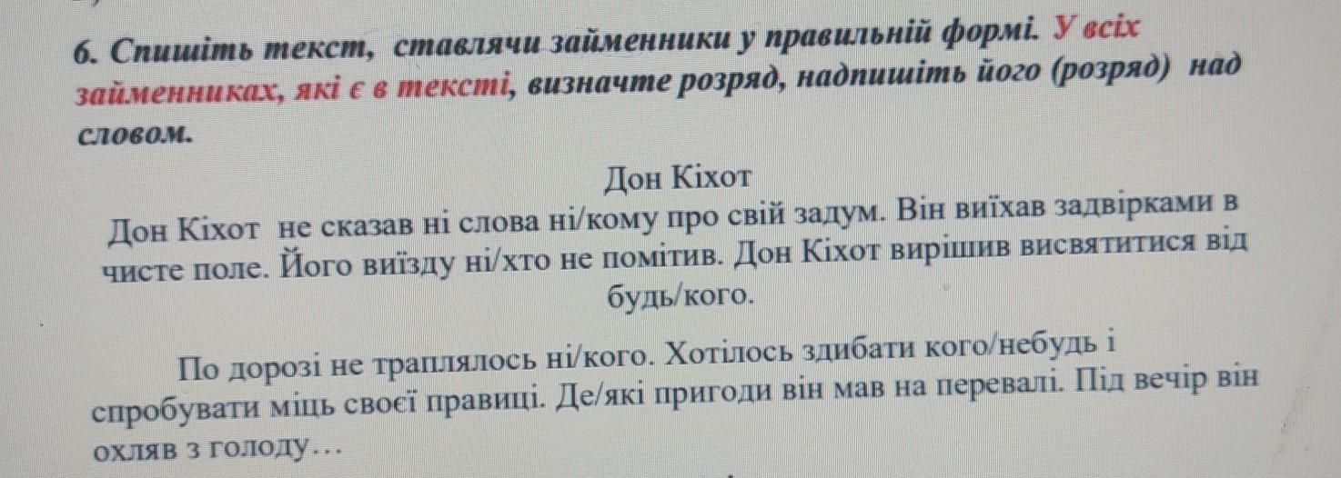 6. Спишіть текст, ставлячи займенники у правильній формі. У всіх займенниках, які є в тексті, визначте розряд, надпишіть його (розряд) над словом. Дон Кіхот Дон Кіхот не сказав ні слова ні/кому про свій задум. Він виїхав задвірками в чисте поле. Його виїзду нi/хто не помітив. Дон Кіхот вирішив висвятитися від будь кого. По дорозі не траплялось ні кого. Хотілось здибати кого/небудь і спробувати міць своєї правиці. Де/які пригоди він мав на перевалі. Під вечір він охляв з голоду... даю 20б!! срочно нужен ответ до 11:50!!!