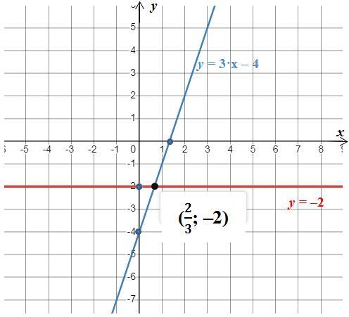 y=0 ⇔ 3·x-4=0 ⇔ x = 4/3 = 1 1/3⇒ (1 1/3; 0);