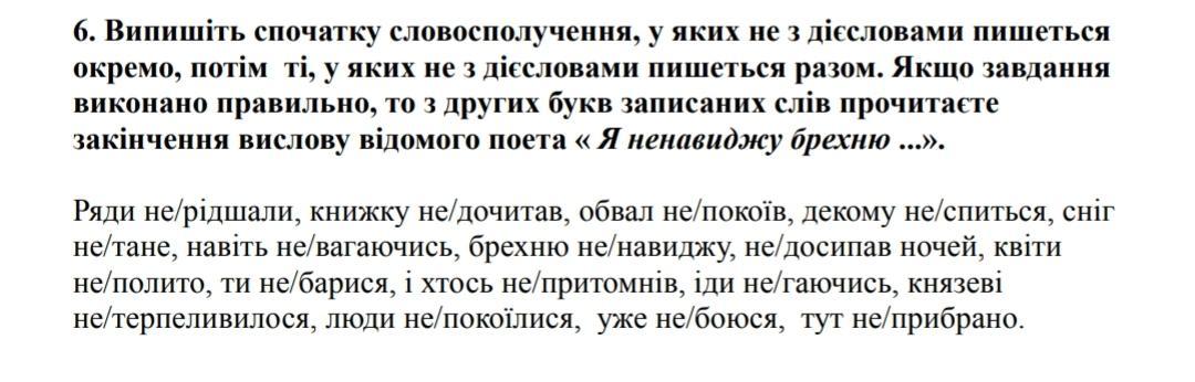 Випишіть спочатку словосполучення, у яких не з дієсловами пишеться окремо, потім ті, у яких не з дієсловами пишеться разом. Якщо завдання виконано правильно, то з других букв записаних слів прочитаєте закінчення вислову відомого поета « Я ненавиджу брехню ...».