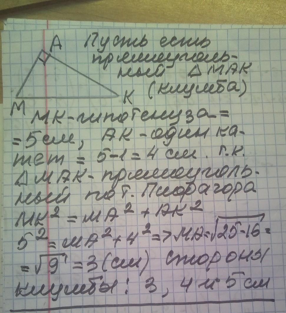Складіть математичну модель по задачі. Квіткову клумба має форму прямокутного трикутника. Сторона, що лежить проти прямого кута - 5 см. Одна з двох інших сторін на 1м менше. Знайти сторони клумби.