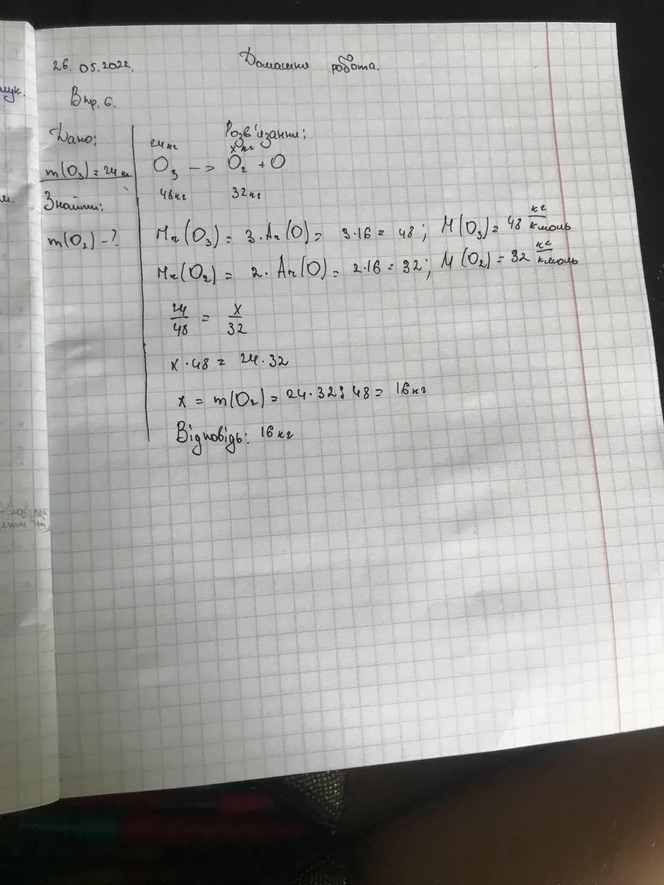 Унаслідок фотохімічних процесів, що відбуваються в атмосфері, озон розкладається за схемою О3 → О2 + О. Обчисліть масу кисню, яка утвориться внаслідок розкладання 24 кг озону.