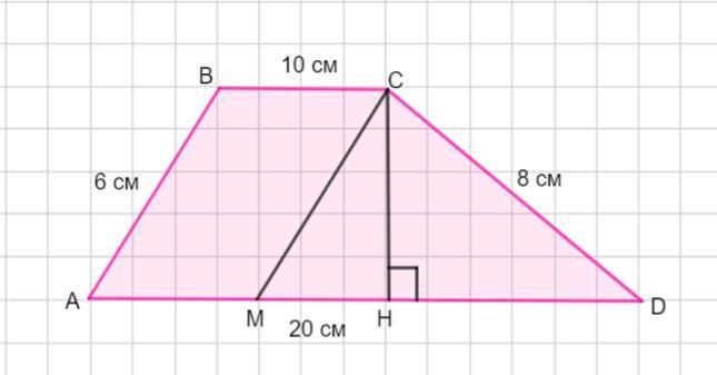Дана трапеция ABCD . Основания ВС = 10 см , AD= 20 см , а боковые стороны АВ = 6 см, CD= 8 см.