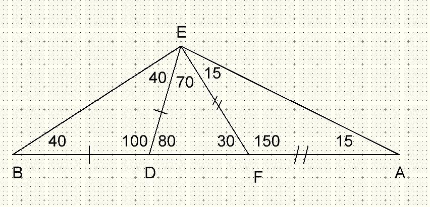 Δ АФЕ рівнобедрений, ∠ А = 15 згідно умови, ⇒ ∠ Е = 15, а ∠ Ф = 100