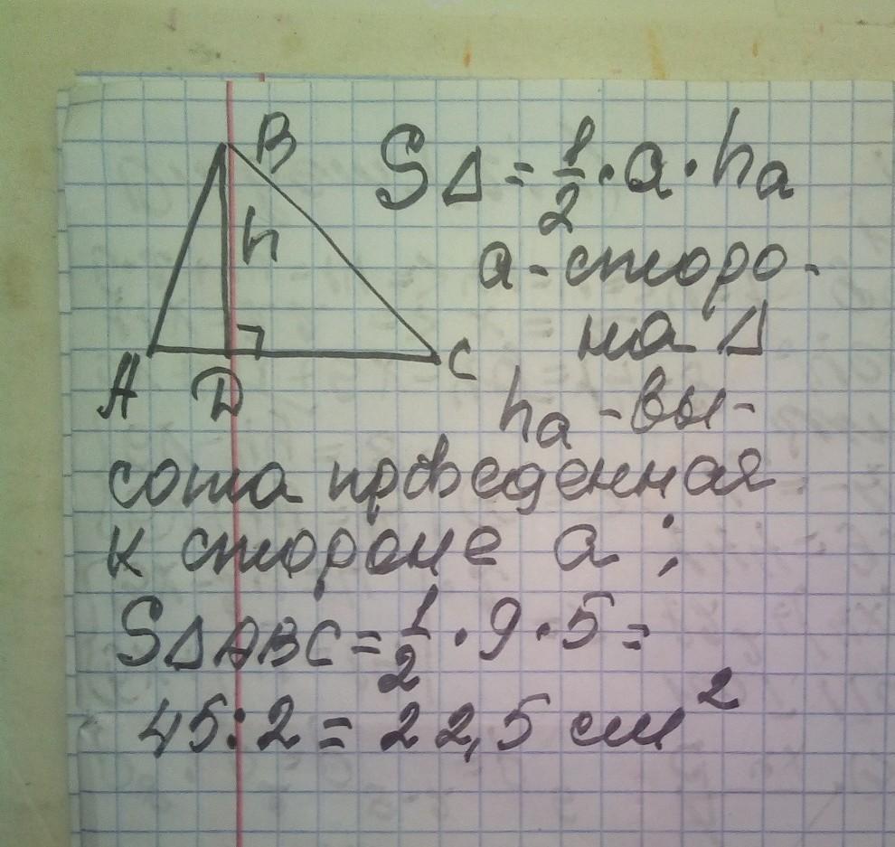 Даю 60 балів.Потрібно ТЕРМІНОВО Знайти площу трикутника зі стороною 9 см , і висотою проведеною до цієї сторони, 5 см