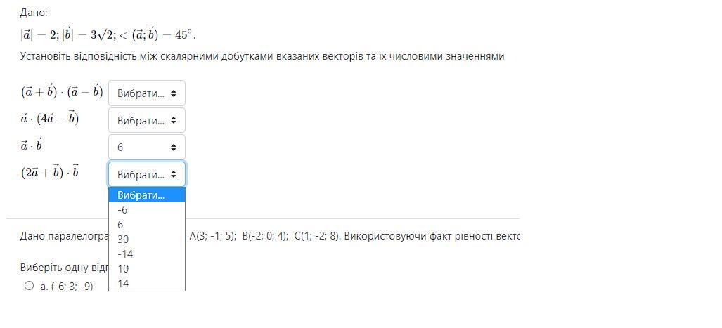 Установіть відповідність між скалярними добутками вказаних векторів та їх числовими значеннями