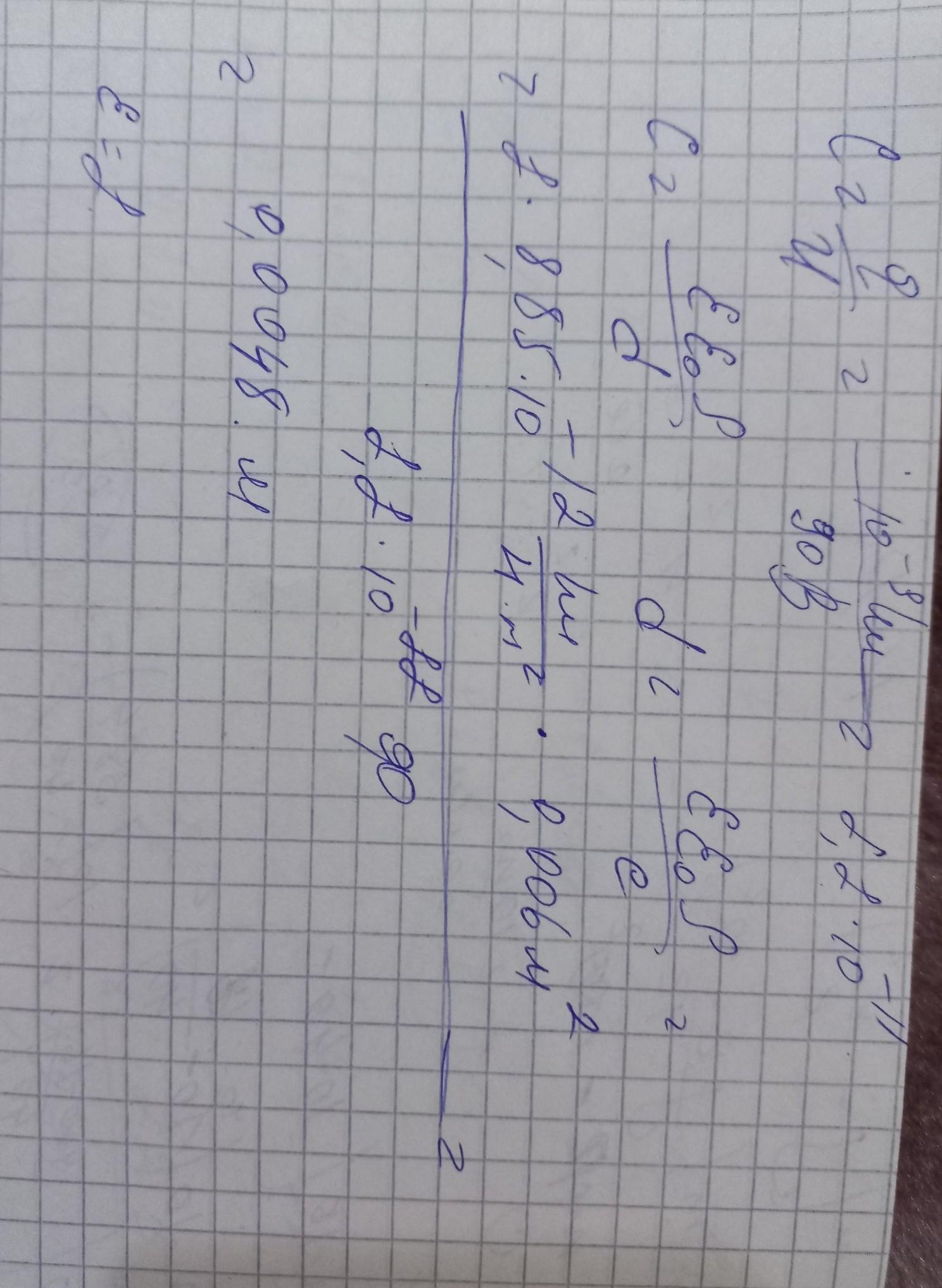 Площа пластин плоского повітряного конденсатора становить 60кв.см., його заряд 1нКл, різниця потенціалів дорівнює 90В. Визначити відстань між пластинами.