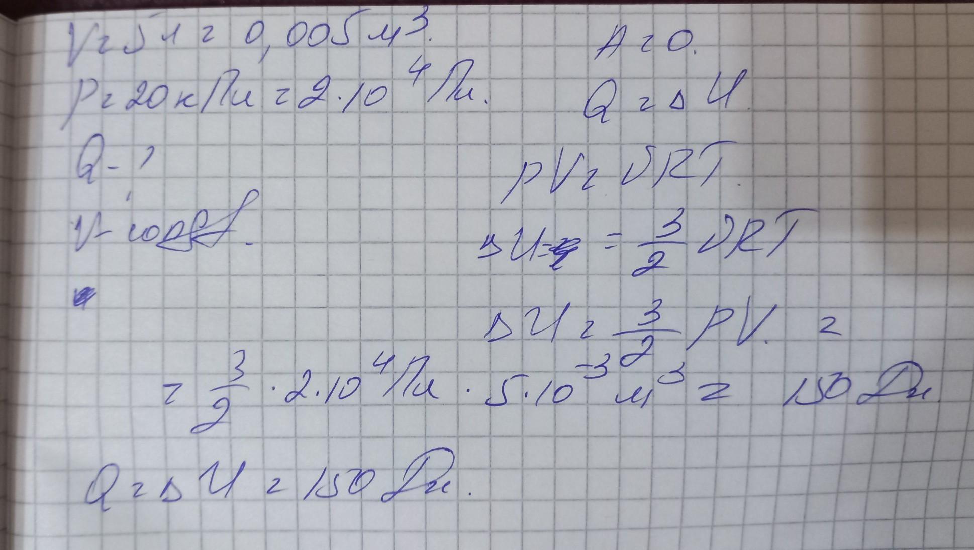 одноатомний ідеальний Газ знаходиться у закритій посудині об'ємом 5 л яку кількість теплоти необхідно надати газу щоб підняти його тиск на 20 кПа