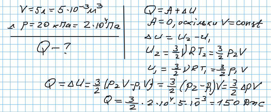 ТЕРМІНОВО одноатомний ідеальний Газ знаходиться у закритій посудині об'ємом 5 л яку кількість теплоти необхідно надати газу щоб підняти його тиск на 20 кПа